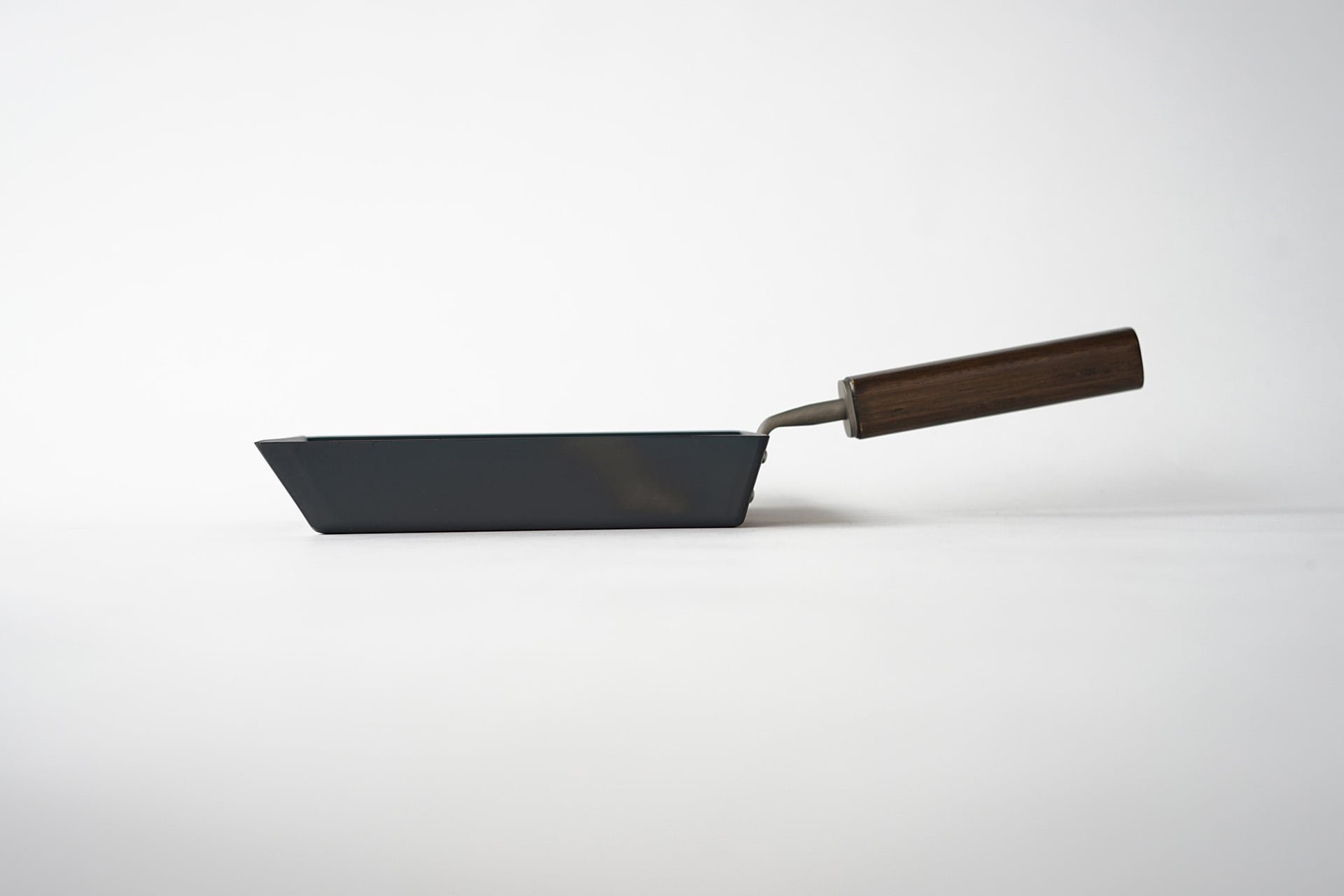 手に持ってみるとずっしりとした重みを感じる玉子焼き用フライパンは、厚さ2mmの鉄を使用しています。この厚みがしっかり蓄熱し、卵液をふんわりと調理します。少し重いと感じると思いますが、熱伝導と蓄熱性のバランスでが大事なんです。ふわっと優しい味わいに仕上がります。