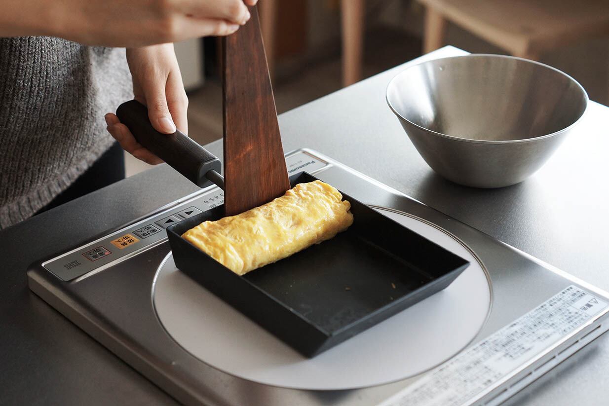 火力は弱めで、少し長く余熱してください。厚さがある分、蓄熱性が高くムラなく均等に食材に熱が伝わり、玉子焼きがふっくらと仕上がります。1回分には玉子3個分が丁度良い量です。