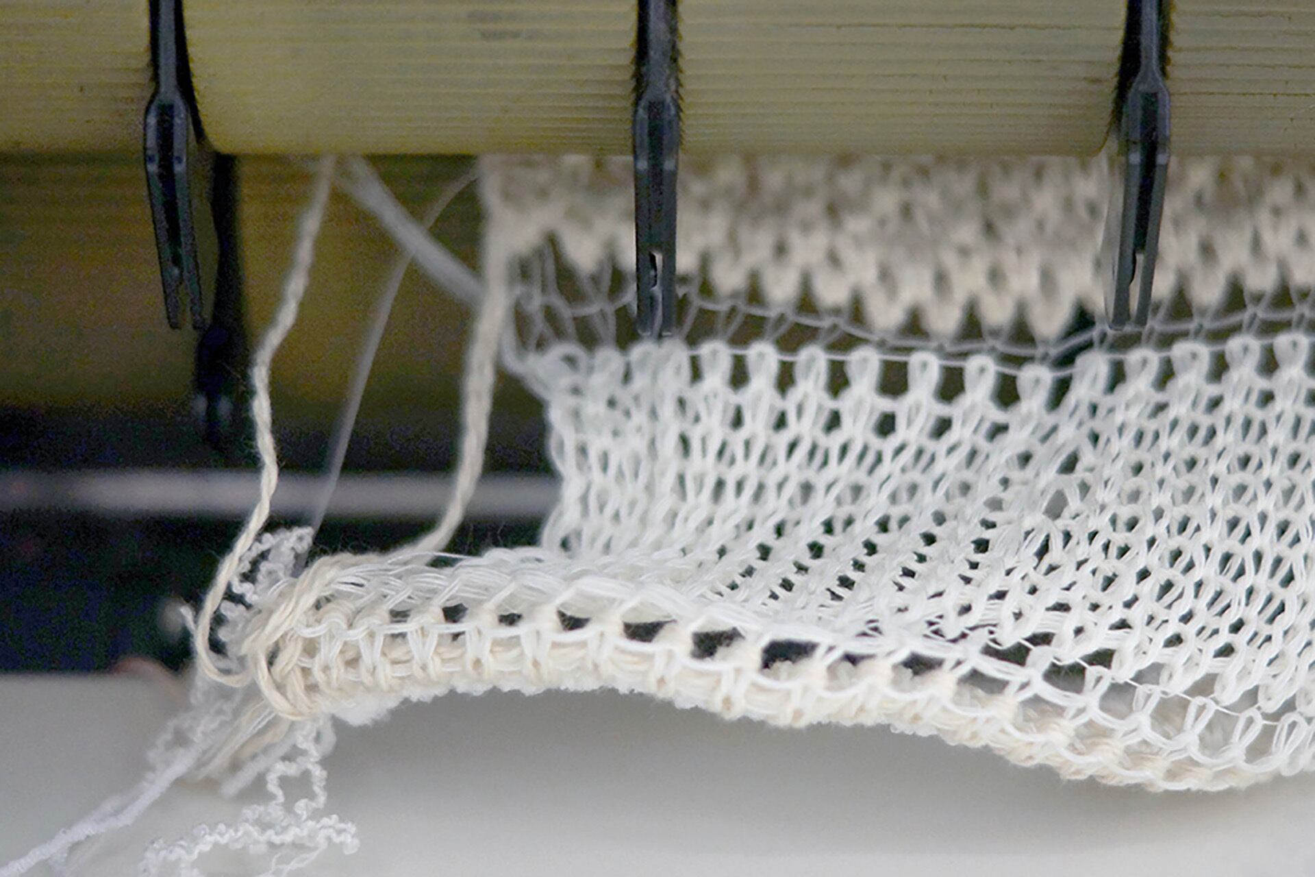初期モデルは4ゲージの編機でしたが、サイフクの最も太番手の編機は5ゲージなので、目の詰まりを調整し、編柄を再現しました。