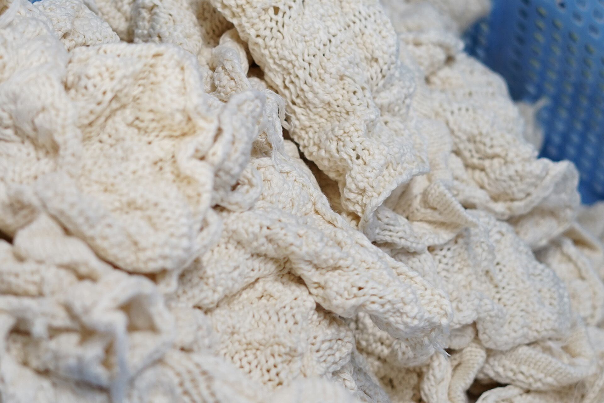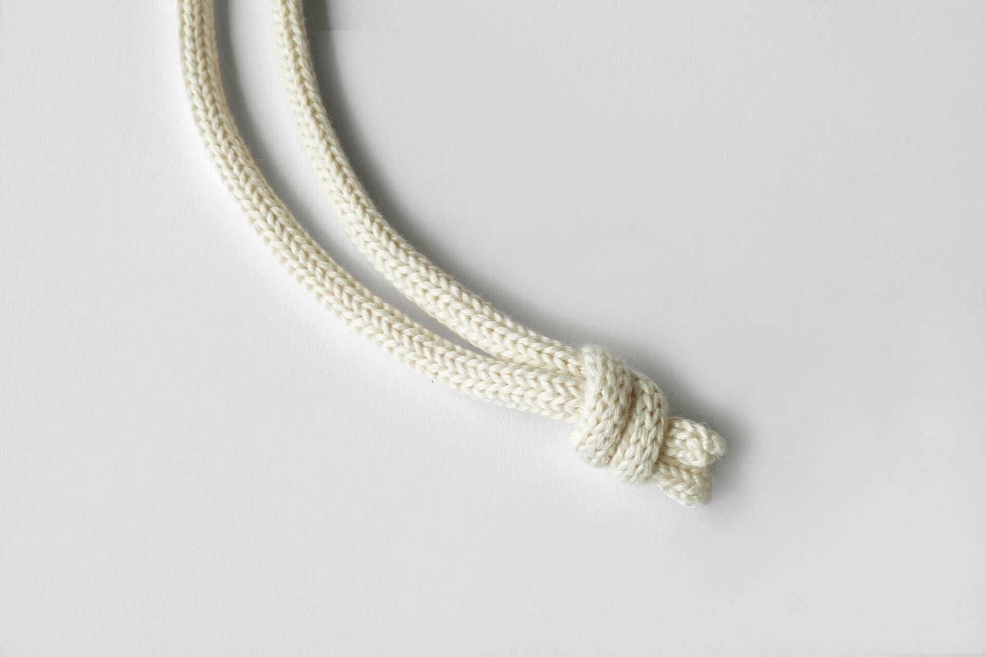 また、裏地を最小の縫い代でミシンがけしています。ニット生地の端の処理は手編みでかがっており、紐通しまで人の手で行っています。